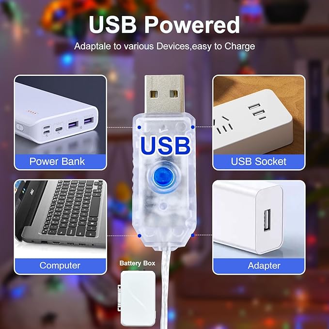 - USB & Battery Dual Powered String Lights: 2 power supply methods are suitable for any scene and location; No more worrying about power outlet or changing batteries frequently; Use USB plugs indoors to achieve optimal lighting effects; Outdoors or in places without sockets, you can use batteries for power supply; Decorate your party with our string lights now (Note: USB power adapter and 3AA battery are not sold with the order)