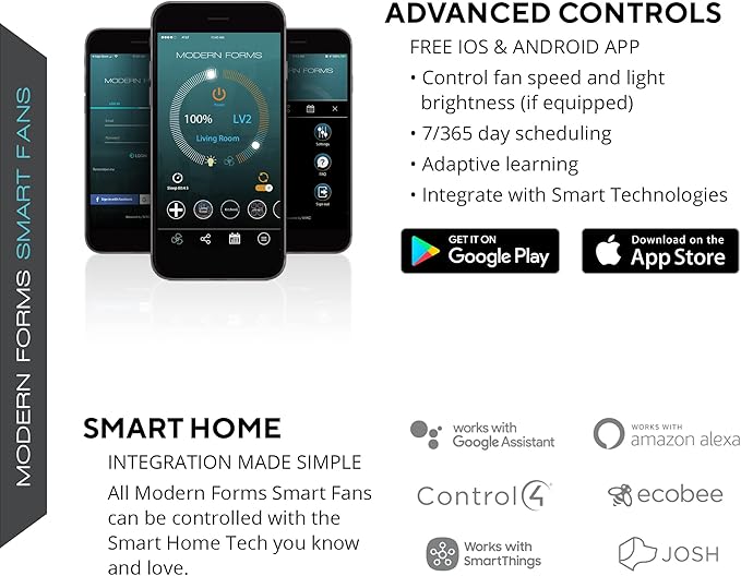 - SMART: Modern Forms Fans pair with the smart home tech you know and love, including Google Assistant, Amazon Alexa, Samsung Smart Things, Ecobee, Control4, and Josh AI.