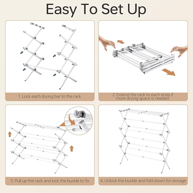 - Easy Assembly - The small laundry drying rack is super easy to put together. Just snap each bar into place and snap the end piece in on top tier for locking