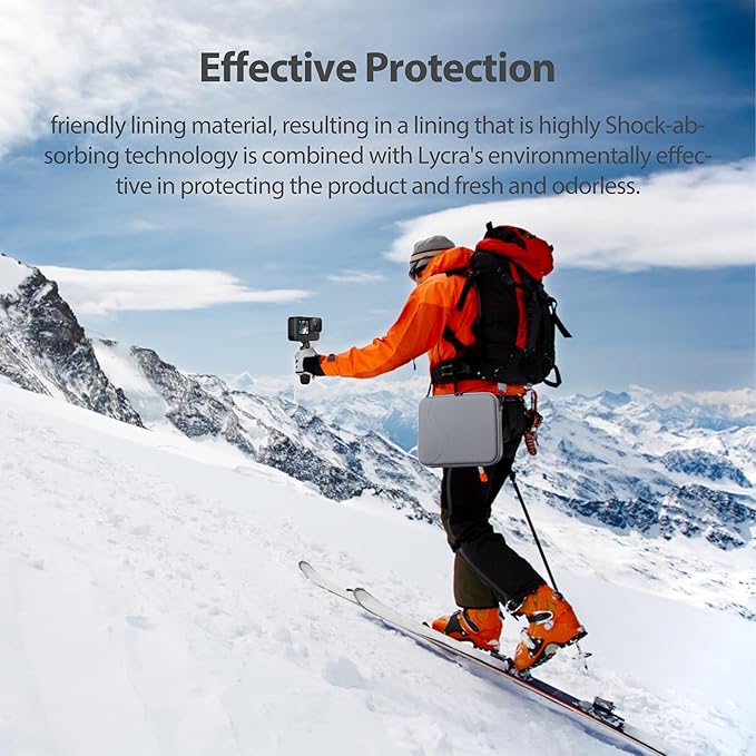 - Integrated Fixed Design with Lining. Can prevent action camera from shaking during transportation, achieving the effect of shock absorption and buffering; The internal partition cushion design can reduce friction between the equipment and the upper cover, providing dual protection during transportation;