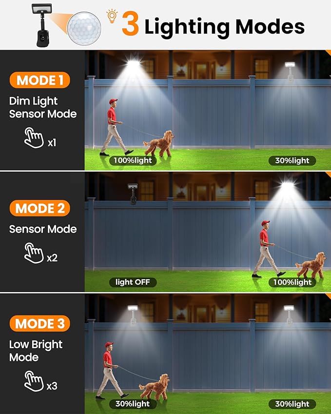 - 3 Smart Modes for All Scenarios .Dim-Bright-Dim / Motion-Activated / Steady Low Light. Detects humans & animals reliably.The solar motion lights outdoor waterproof easily detects movement from people or animals, ensuring reliable performance