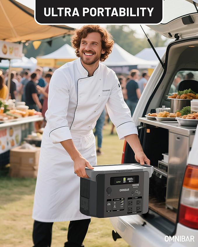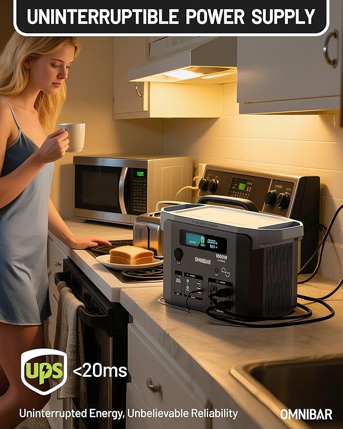 - 10-Year Long-Lasting LiFePO4 Battery: The Omnibar Portable Power Station 1000W is equipped with advanced LiFePO4 (LFP) battery cells, offering over 3,000 full charge cycles for outstanding lifespan, stability, and safety. Built for long-term, reliable, and eco-friendly power, it's an ideal choice for outdoor adventures, RV travel, home backup, and emergency use.