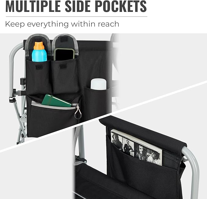 - Convenient Storage Solutions: Equipped with dual-layer side bags, this chair provides ample storage for your essentials. Keep your phone, snacks, and other items within easy reach, so you can enjoy your outdoor activities without the hassle of searching for your belongings.