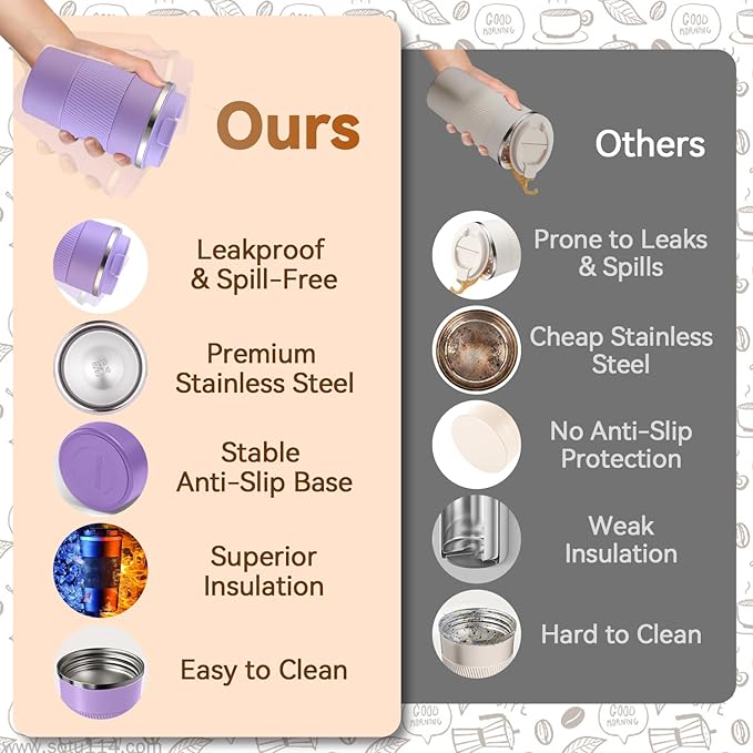 - Superior Thermal Insulation: Featuring advanced double-wall vacuum insulation, this travel mug effectively preserves the temperature of your beverage without causing heat transfer or condensation on the outer surface. Whether you're enjoying a hot brew or a cold refreshment, your drink stays enjoyable from the first sip to the last.
