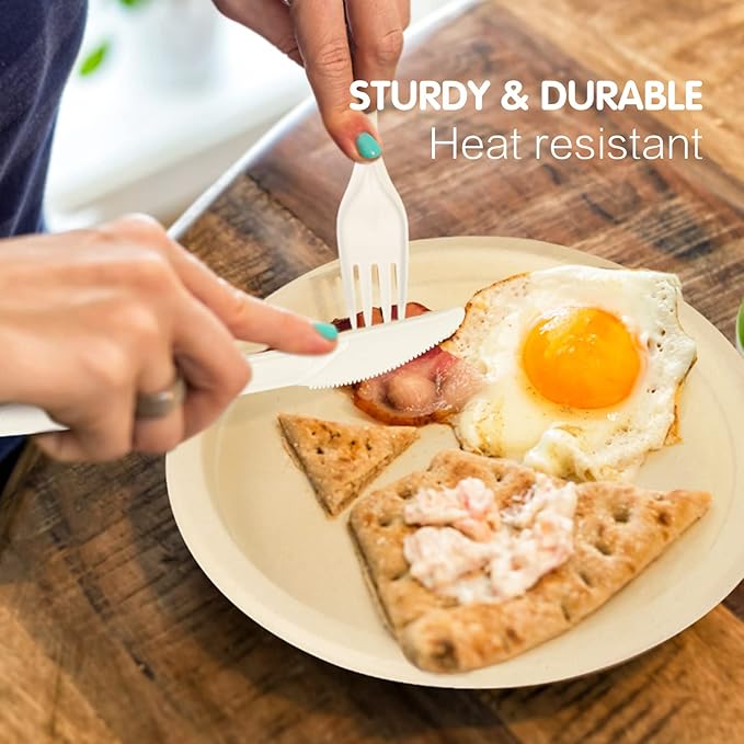 - 【Natural Material】Our disposable cutlery set made from Non-GMO Corn Starch. Tree-free, plastic-free, recyclable and natural