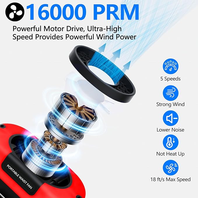 AI Portable Waist Clip Fan, Upgraded 10000mAh Rechargeable Battery Wearable Belt Personal Fan, 16000RPM Powerful 5 Speeds Shirt with Flashlight Neck Hands-Free 40H Cooling (Red)