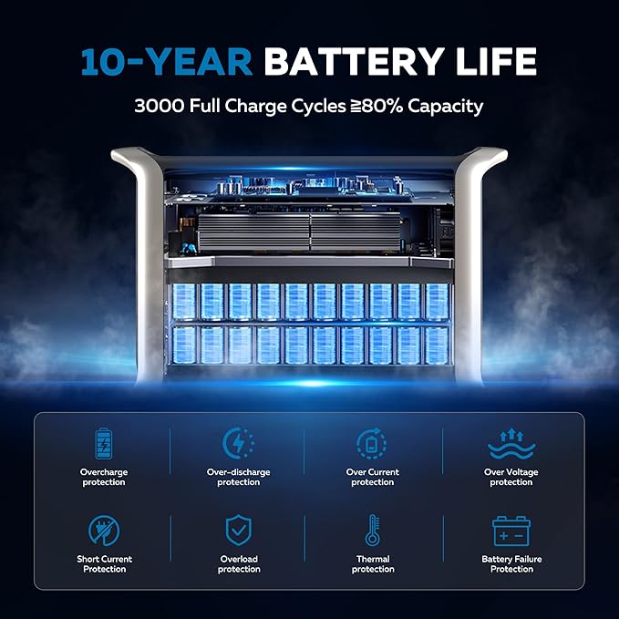 - [Long-Lasting Battery & Advanced Safety Features]: The portable power station is equipped with an LFP battery, offering 3,000 charge cycles and a 10-year lifespan. The solar panel features a smart PWM controller, providing protection against overcharging, overcurrent, short circuits, and more, ensuring safe and reliable operation.