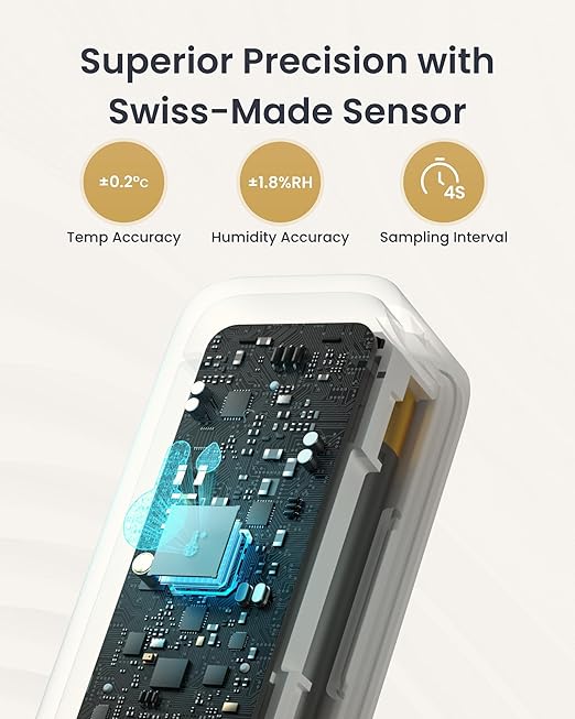 - High Precision Monitoring with Swiss Sensirion Sensor: Equipped with an industrial-grade Swiss Sensirion sensor, this temperature and humidity monitor delivers exceptional accuracy (± 1.8% RH, ± 0.2 °C/0.36 °F) and a rapid 4-second sampling interval for real-time tracking of environmental changes.