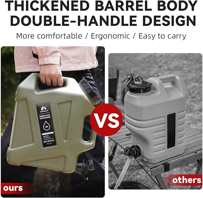 - 【 LEAK-PROOF Lid & Water Spigot 】Our Camping Water Storage has has a sealing cover and leak-proof faucet that ensures safe storage and easy transportation, without worrying about leaks or spills while in use. It a unique faucet design and 2 extension spigot. Compared to other containers, you don't have to struggle to unscrew the lid, you can dispense water with a simple knob and control the water volume. The extension pipe can be stored in the grooves of the barrel body making storage more convenient.