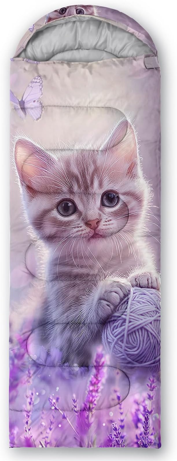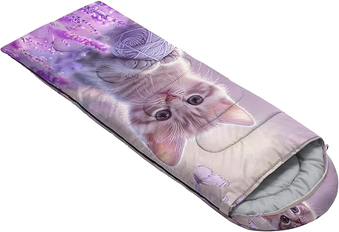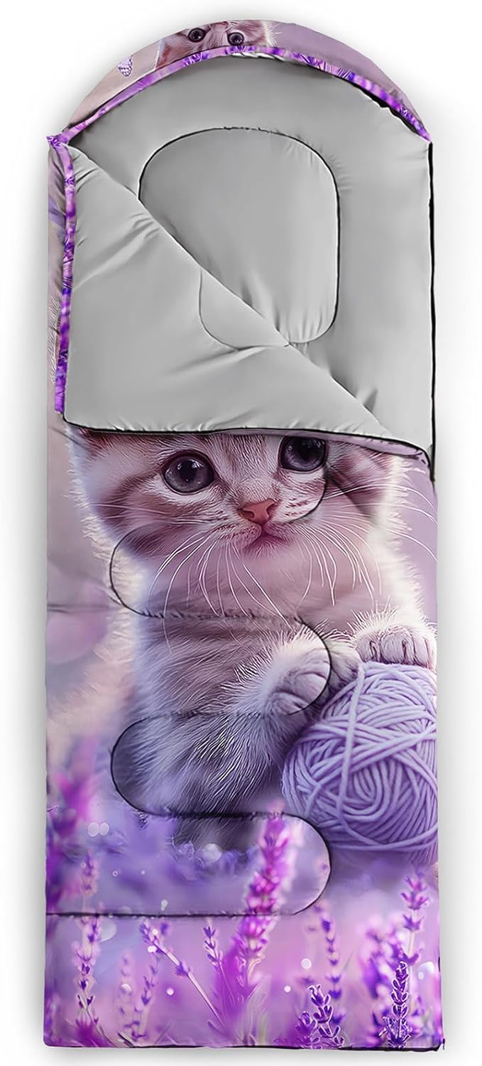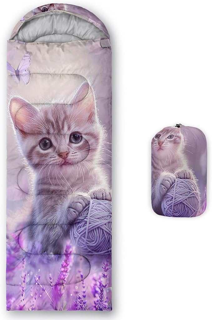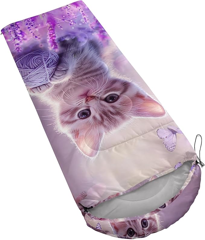 - 【Fashion Design】This waterproof and lightweight sleeping bag is designed with a cute cat pattern.Cat is rolling a ball of string in lavender bush surrounded by butterflies,which adds a comfortable atmosphere.As camping essentials,you can give it as a gift to your family and friends.