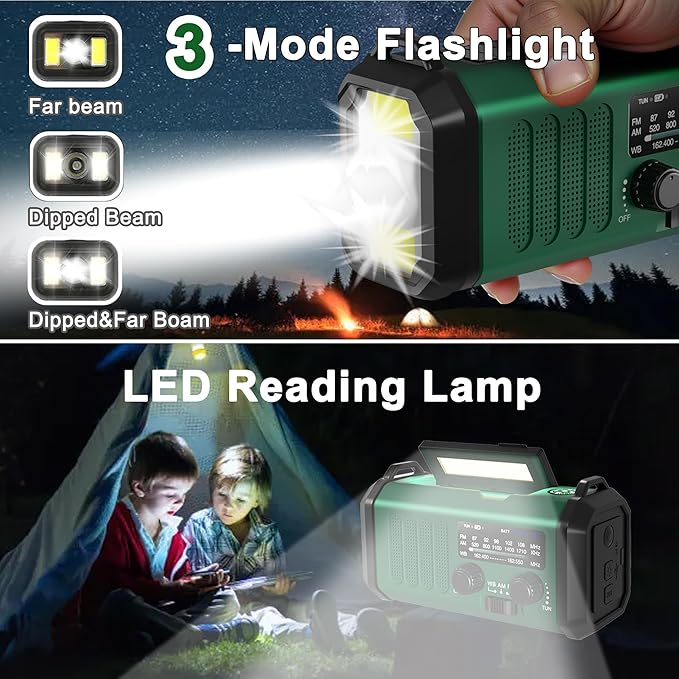 - 【All-in-One Portable Radio with LED Flashlight/Reading Lamp】Our hand crank radio is also designed for outdoor survival- provides 2 light sources with 3W LED flashlight can provide light to a wide area and better vision when you need to move at night or power failure. 2.5W Reading Lamp to illuminate room or campsite while camping. Emergency radio can as a power bank charge your cell phone or portable device for calling for help in emergency, such as thunderstorm, hurricanes.