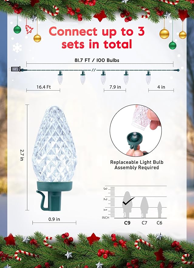 - Special Feature : LED C9 String Lights, Waterproof, 8 Lighting Modes, Timer, Connectable, Christmas Tree Decorations