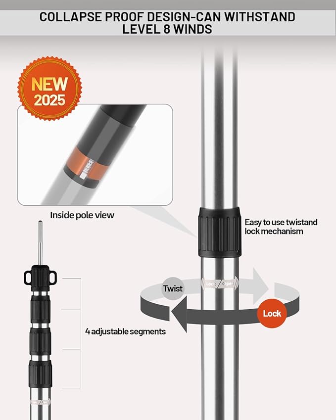 - DOUBLE ANTI-COLLAPSE DESIGN: Based on the first layer of locks, we upgraded and added a layer of locks, which can better prevent the tent pole from falling vertically during use, and can withstand level 8 winds