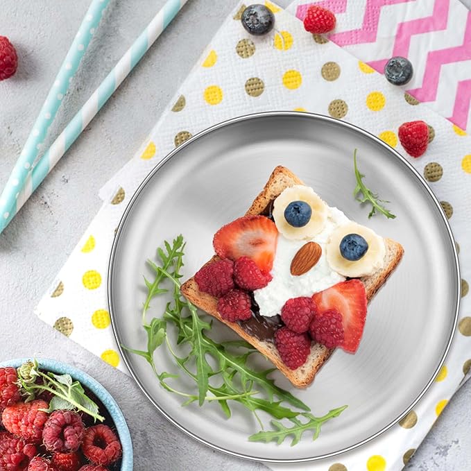 - Decent Quality, 4 pieces nontoxic metal round kids plates set is made of 304(18/8) stainless steel, without harmful substance, ensure the health of kids, toddler and adults, fancy dinner plates with excellent rust and corrosion resistance for strong durability, reusable plates dishes set for 4 to serve you well for a long time