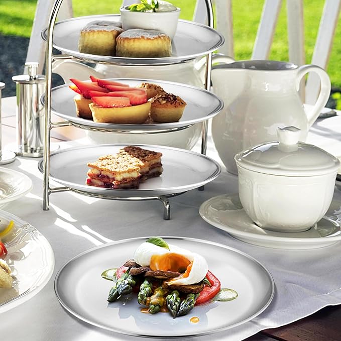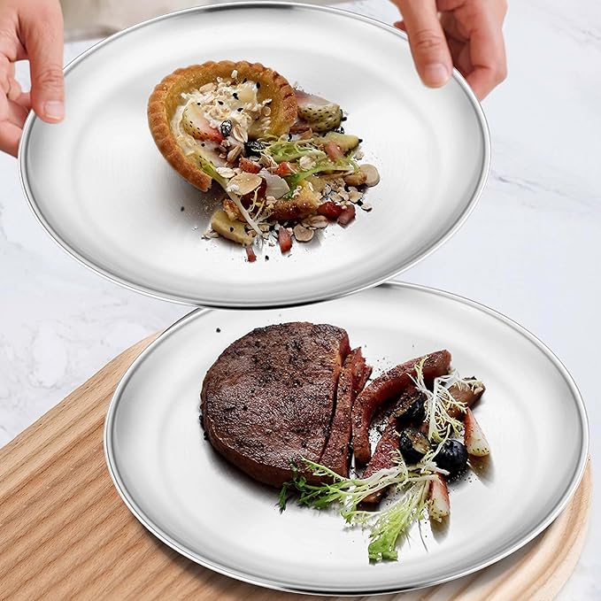 - Decent Quality, 8 pieces nontoxic metal round kids plates set is made of 304(18/8) stainless steel, without harmful substance, ensure the health of kids, toddler and adults, fancy dinner plates with excellent rust and corrosion resistance for strong durability, reusable plates dishes set for 8 to serve you well for a long time