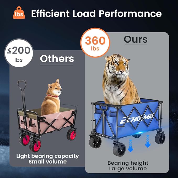 - 【Carry More & Less Effort】The collapsible wagon features a reinforced metal frame that supports up to 360 lbs. The oversized 150L interior (33" x 18.5" x 16") gives you plenty of room for groceries, camping gear, sports equipment, or garden tools. Includes a removable 600D Oxford fabric liner that’s waterproof, easy to clean, and made to handle heavy use. Two mesh cup holders keep your drinks stable and within easy reach on the go.