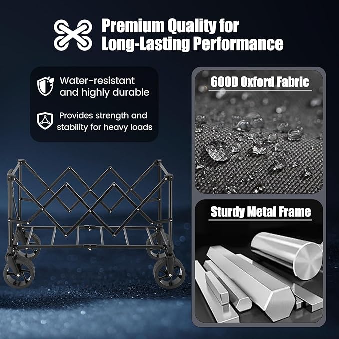 - 【Carry More & Less Effort】The collapsible wagon features a reinforced metal frame that supports up to 360 lbs. The oversized 150L interior (33" x 18.5" x 16") gives you plenty of room for groceries, camping gear, sports equipment, or garden tools. Includes a removable 600D Oxford fabric liner that’s waterproof, easy to clean, and made to handle heavy use. Two mesh cup holders keep your drinks stable and within easy reach on the go.
