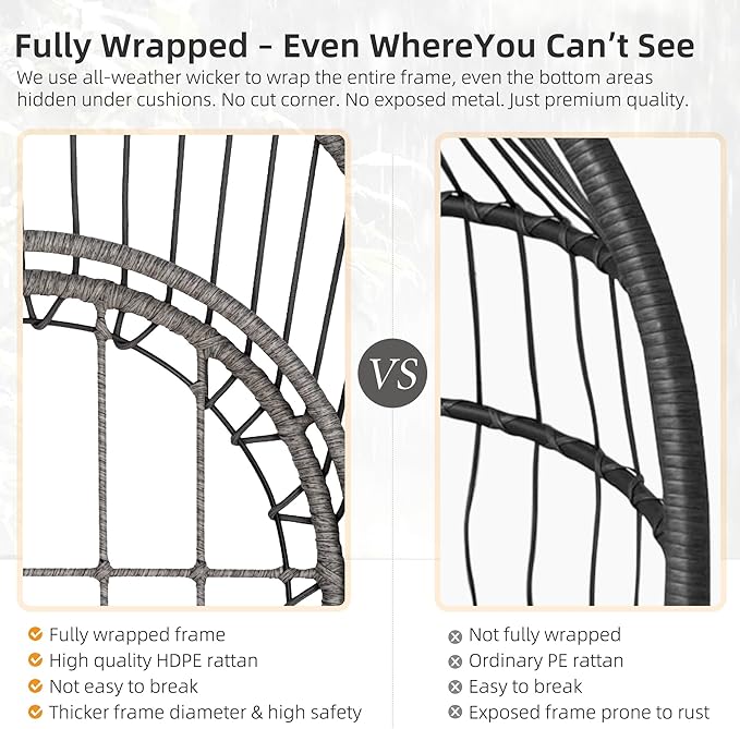 - 【Ultimate Comfort & Versatile Indoor-Outdoor Use】Designed for superior relaxation, this hanging egg chair includes a cloud-soft seat cushion and headrest pillow, made from 100% polyester fabric and plush cotton filling. The cushions are breathable, fade-resistant, and machine washable, ensuring long-lasting comfort. Ideal for living rooms, bedrooms, patios, gardens, this stylish swing chair enhances any space—perfect for enjoying a cup of tea, sunbathing, or reading a book.