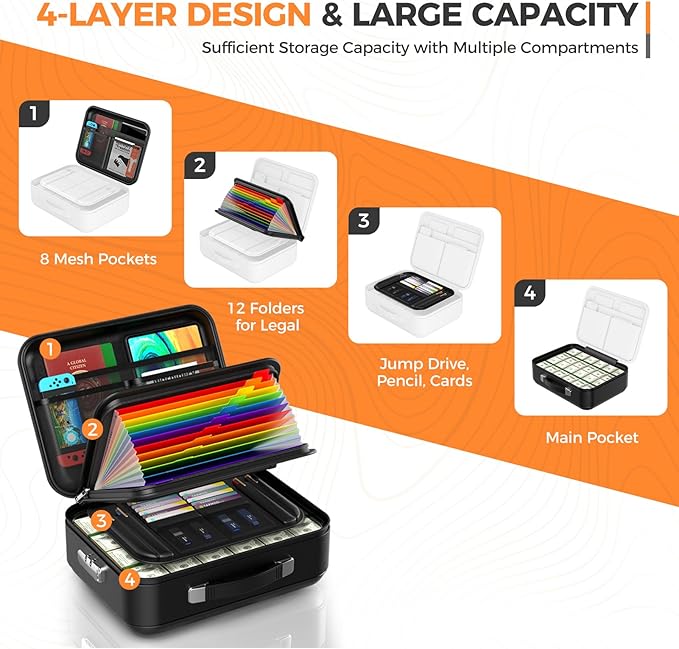 - Large Capacity & Multi-Compartment Storage: With a size of 15.8 x 11.8 x 5.4 inches, this fireproof document box provides ample space. It features 12 accordion folders, 2 main mesh pockets, 16 card slots, 2 USB pockets, and 4 pen slots