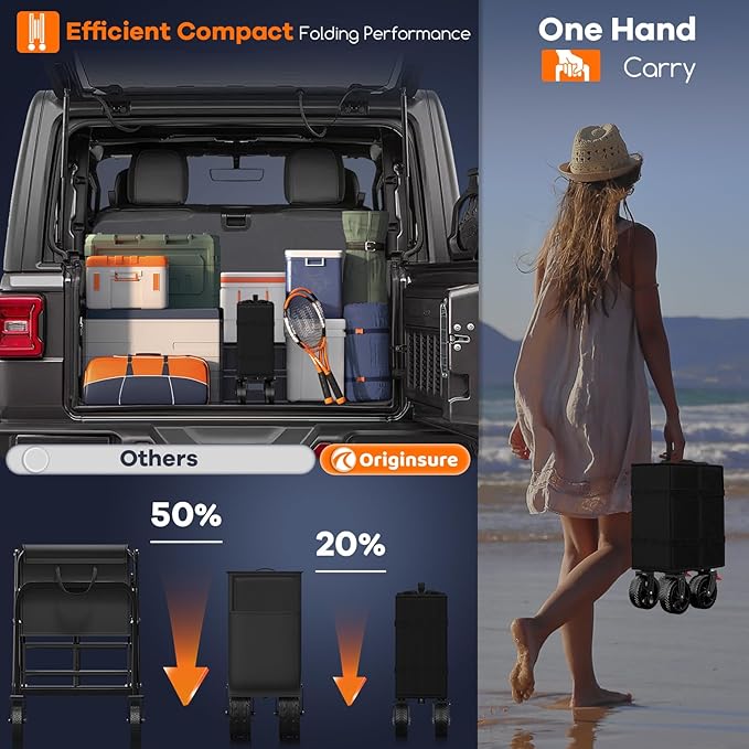 - ใ๐ณ.๐ฒ๐ต ๐ฐ๐ ๐ณ๐ ๐๐ฎ๐ฟ๐ด๐ฒ ๐๐ฎ๐ฝ๐ฎ๐ฐ๐ถ๐๐ ๐๐ถ๐๐ต ๐ฆ๐บ๐ฎ๐น๐น๐ฒ๐ฟ ๐๐ผ๐น๐ฑ๐ฒ๐ฑ ๐ฆ๐ถ๐๐ฒ ๐ฃ๐ผ๐ฟ๐๐ฎ๐ฏ๐น๐ฒ ๐๐ผ๐น๐น๐ฎ๐ฝ๐๐ถ๐ฏ๐น๐ฒ ๐๐ฒ๐ฎ๐ฐ๐ต ๐ช๐ฎ๐ด๐ผ๐ปใOriginsure foldable wagon cart, 38.58 "L x 21.65 "W x 22.44 "H large unfolding size, 7.69cu ft/220L massive storage space, double the capacity of similar wagons. Adopting an innovative folding design that maintains its height, the Capacity reduces to 1.36 cu ft when folded, only 1/3 of other carts. Compact and space-saving, it can be perfectly stored in the car trunk and room corners.