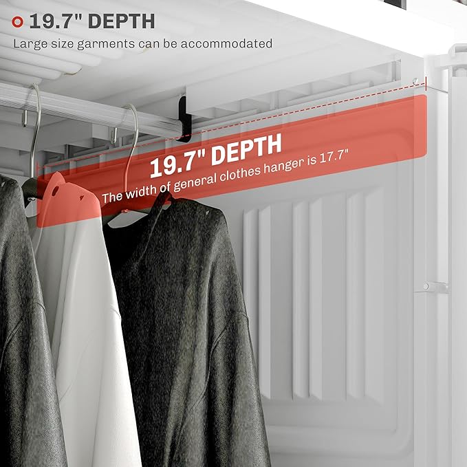 - Organized Storage Solution: Our cabinet's multiple cube compartments and a dedicated hanging area. The top space for storing empty suitcases or duffle bags. With a depth of 19.7", it provides ample storage space, deeper than standard models