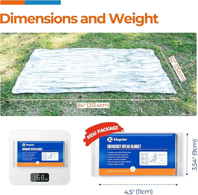 - LARGE DUAL SIDED SURFACE: The emergency blanket size is 52"x84", cover as much of head,torso,and limbs as possible,trapping body heat of human up to 6 foot 5 inch tall