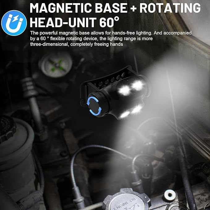 - Ultra Lightweight But Ultra-Bright Headlamp : Weighing only 2.2 oz, Illuminate any task or trail with a powerful high-lumen beam, featuring adjustable brightness 4 modes(right spotlight/left floodlight/spotlight+floodlight/sos strobe) for optimal visibility in camping, hiking, repairs, or emergencies. (one key turn off, You can long press to turn off the Headlamp in any mode.)