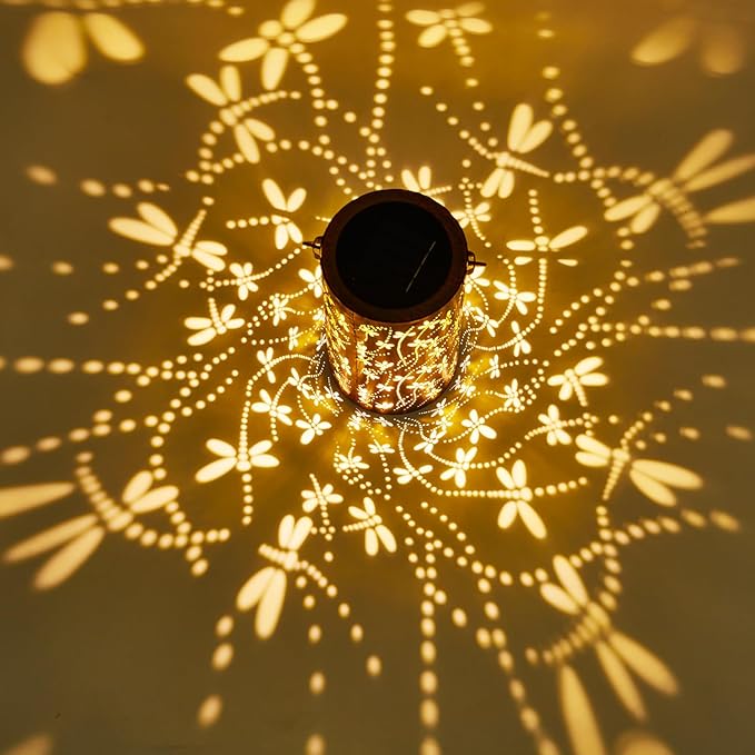 - 【Elegant Vintage Design】Featuring a classic antique bronze finish and elegant pattern, this solar light radiates a warm light at night. The beautiful shadow effect creates a cozy atmosphere, perfect for outdoor parties or decorative lighting.Outdoor solar dragonfly lantern is the best gifts for mom, sister, grandma, women birthday