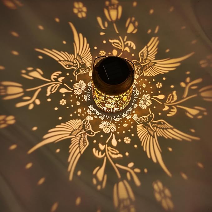 - 【Elegant Vintage Design】Featuring a classic antique bronze finish and elegant pattern, this solar light radiates a warm light at night. The beautiful shadow effect creates a cozy atmosphere, perfect for outdoor parties or decorative lighting.Outdoor solar hummingbird lantern is the best gifts for mom, sister, grandma, women birthday