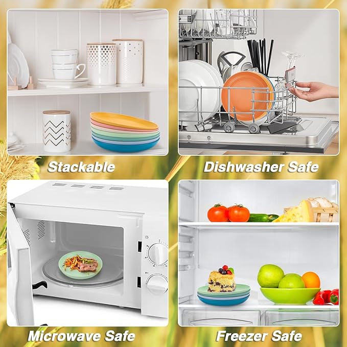 - Lightweight and Unbreakable - Our wheat plates set are light to hold, they are unbreakable, chip resistance, no worry about falling down. Stackable plastic dinner plates save much space and easy to carry.