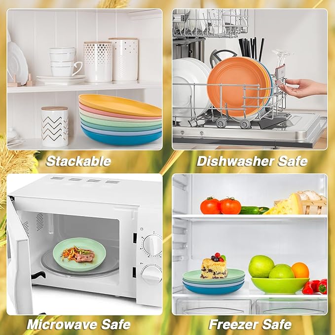 - Package: 8 x colorful wheat straw dinnerware sets can meet indoor and outdoor use for whole family. Not only are kitchen plates and salad plates, also is great camping plate set. Size: 10 inch.