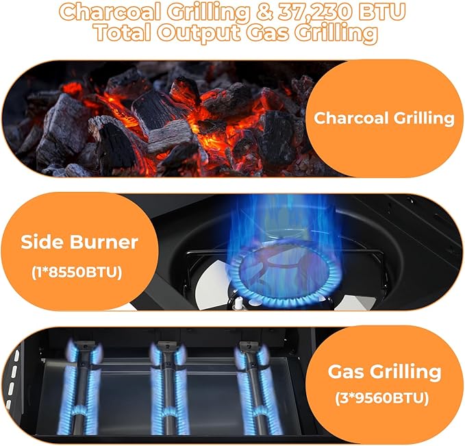 - 【High Heat Output】With a gas heat output of 37,230 BTU and adjustable charcoal combustion intensity, this grill ensures quick and even cooking. It delivers consistent heat for meal every time, making grilling easy and efficient
