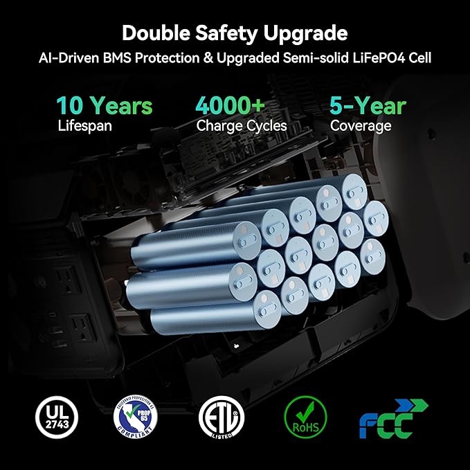 - 【Revolutionary Extended Runtime Tech – 1.5X More Runtime】Powered by advanced semi-solid LiFePO4 cells and AI-driven BMS, the 600L power station offers 1.5X extended runtime for appliances under 300W. Experience reduced energy loss, higher efficiency, and stable output for longer-lasting performance.It delivers over 4000 charging cycles and 10+ years of reliable use. Advanced thermal management and 56+ safety protections guarantee superior durability and safety for outdoor and indoor power.