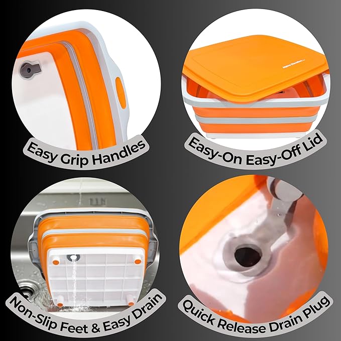 Collapsible Large (8L) BBQ Marinating Tub w/Cutting Board | Multipurpose Food-Grade TPE Prep Tub w/Lid | Built-in Colander & Drain Plug - for Camping | Tailgate | Picnic - Bold Orange
