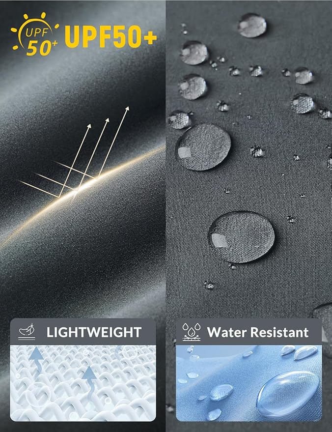 • Made of water resistant fabric, it can resist light rain while maintaining breathability. The elastic sun-protective fabric not only protects your skin but also enables you to move freely.
