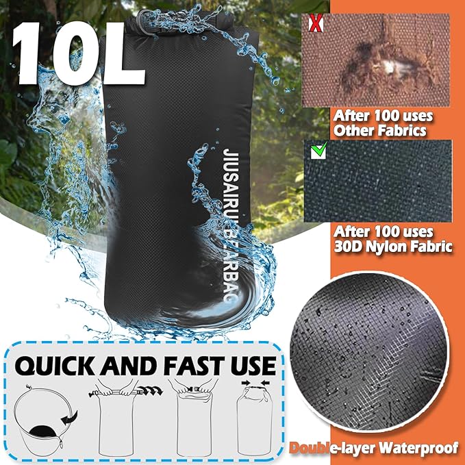 - 【Ultralight & Compact – Just 7.8oz】The Lightweight waterproof bag and 2*10M Ropes and 2*carabiners with Stone bag weighs only 7.8 oz (approximately 220g), about the same asan apple. Its design also makes it extremely Portable, shrinking down to the size of just half your palm. When not in use, you can easily mount it on your backpack with the carabiners.