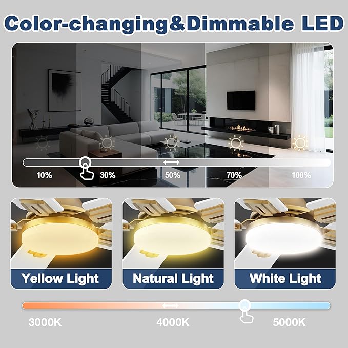 - 【Dimmable& Color-changing LED Light】The 5 blades of ceiling fan with LEDx20W CCT, 3 color temperature Warm Light 3000K, Natural Light 4000K, and Day Light 5000K. The lighting can be dimmed 0~100%, suitable for various scenarios such as reading, gatherings, and relaxation, making it easy to cope with diverse life situations