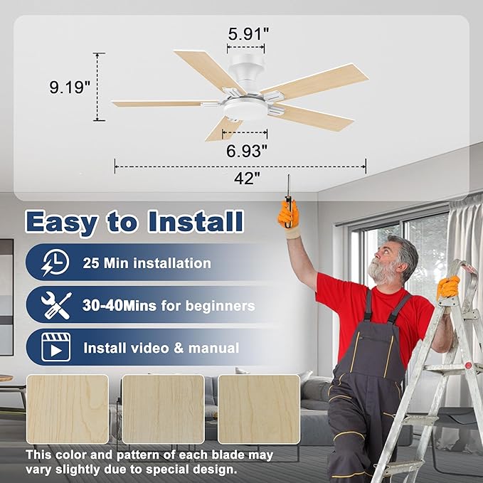 42 inch Smart Low Profile Ceiling Fan with Lights Remote,Quiet DC Motor,WIFI Control via Voice Alexa,App, Easy to Install,Flush Mount Outdoor Indoor Fans for Small Bedroom Patio Porch,White& Wood