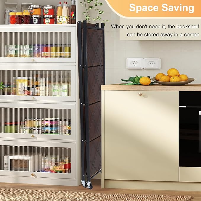 5-Tier Foldable Storage Shelves with Wheels, Folding Metal Shelf Unit, Folding Bookshelf no Assembly, Collapsible Shelves for Craft Shows for Kitchen, Bedroom, Living Room, Rustic Brown