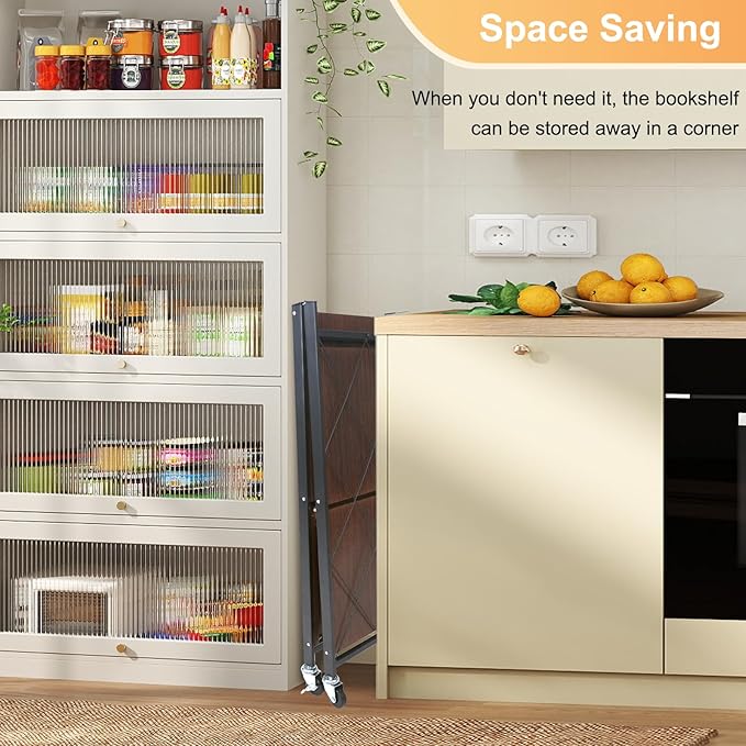 - EASY TO ASSEMBLE: The folding shelves simply open the frame and adjust the shelves on top. The whole process takes less than 30 seconds, no assembly and no tools required. When not in use, it can be folded, and when folded, it measures only 3.74 inches, so it can be placed in any corner. Can also be used as garage storage, rolling bookshelf, kitchen storage, commercial shelving, etc. Perfect for storing kitchen utensils, books, files, tools, sales items, crafts and unused clutter.