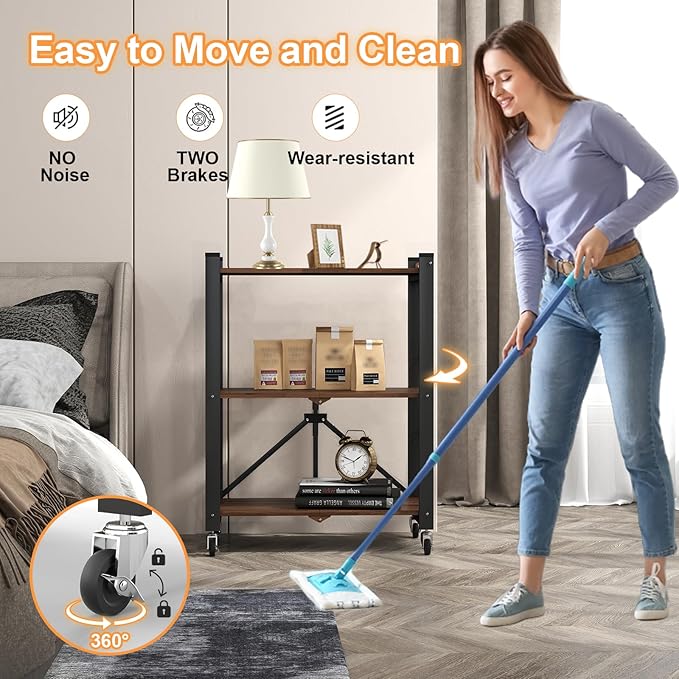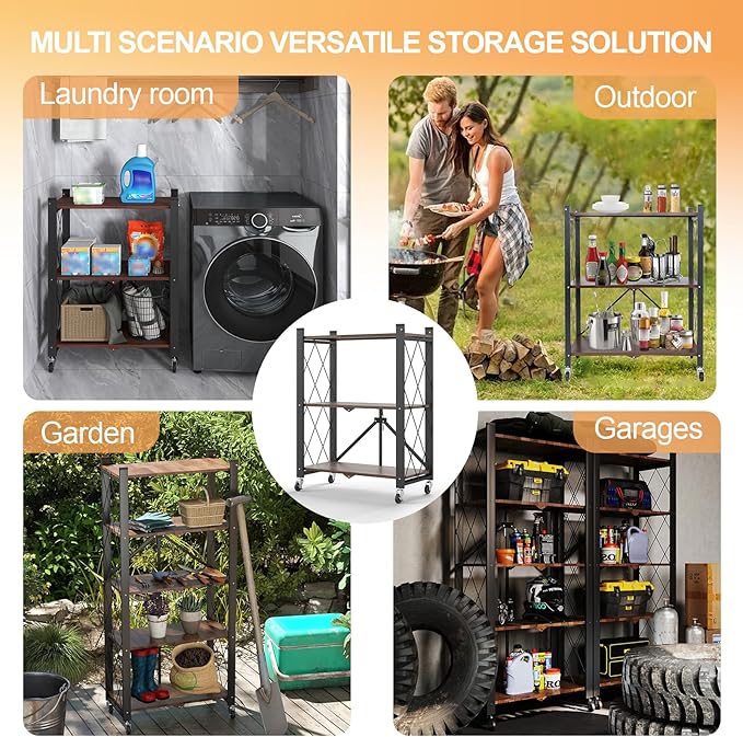 - FOLDABLE DESIGN: If you are looking for folding racks shelves, our one-piece folding frame design will be your first choice. In addition to the folding design, our storage racks also come with larger 360° free-spinning lockable casters that can be easily moved around, making them the perfect choice for rolling storage racks. Best of all, when you want to clean up your space, the four gimbaled wheels allow you to move freely without being restricted by terrain for easy cleaning.