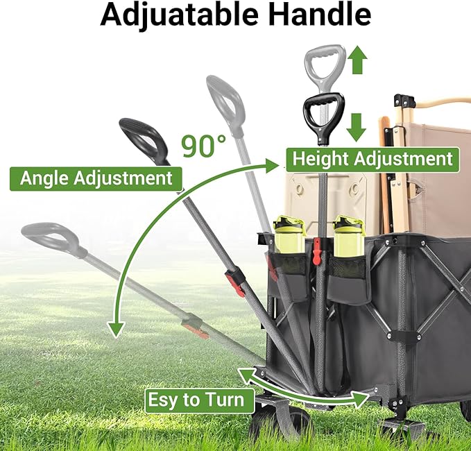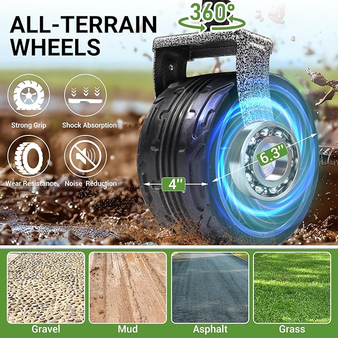 - All-Terrain 360° Wheels – Four 6.5" x 4" rugged wheels with dual bearings glide smoothly over sand, gravel, grass, and bumps. Front brakes prevent rolling.