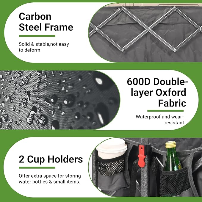 - 450LBS Heavy-Duty Capacity – Reinforced steel frame + 600D Oxford fabric withstands heavy loads (tools, groceries, gear) while resisting tears and rust.