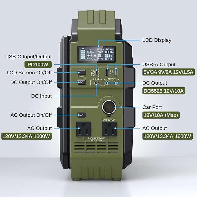 - 【Safe & Steady Power Supply】:With a 1600W (3200W peak) pure sine wave output and 1024Wh capacity, this portable power station can run refrigerators, CPAP machines, tools, and more. Equipped with 8 ports (AC/DC/USB-C PD 100W), it’s perfect for outdoor adventures, home backup, and emergencies.