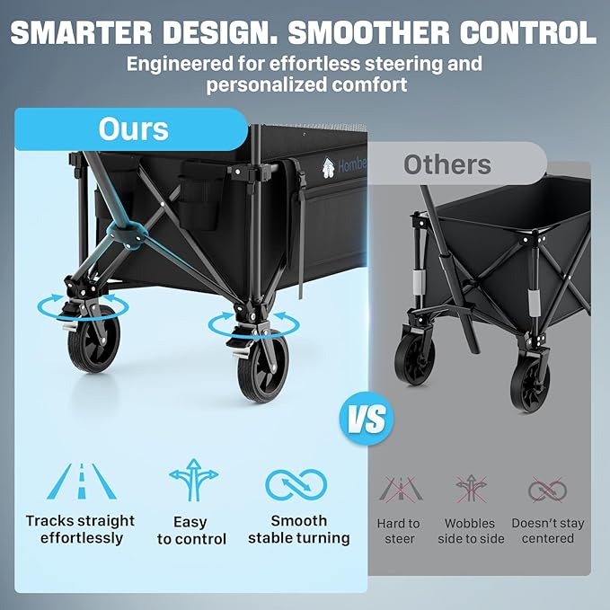 - Smart Steering & Adjustable Handle on Folding Wagon Cart with Wheels Our collapsible wagon with wheels features upgraded steering and a 90° adjustable handle for straight-line stability and easy control, even on uneven ground.