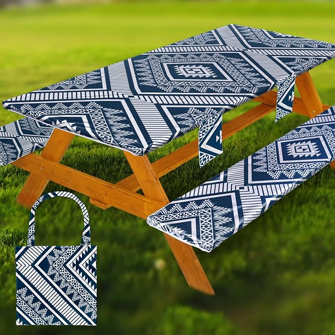 Fitted Picnic Table Cover with Bench Covers Waterproof Elastic Edges Rectangle Patio Tablecloth Outdoor Camping Essentials Stuff Rv Accessories Summer Trip Travel Camper Gifts for Woman Men, 72in 6 ft
