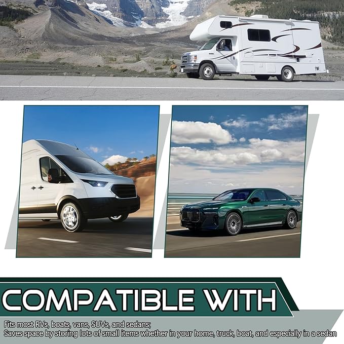 - compatible with:Fits most RVs, boats, vans, SUVs, and sedans; stores a large number of small items in your home, truck, boat, or sedan, saving space and keeping it quiet