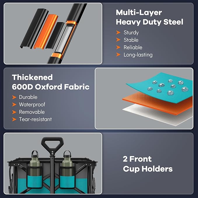 - ใ๐ฐ๐ฒ๐ฌ๐๐ ๐ช๐ฒ๐ถ๐ด๐ต๐ ๐๐ฎ๐ฝ๐ฎ๐ฐ๐ถ๐๐ ๐๐ฒ๐ฎ๐๐ ๐๐๐๐ ๐จ๐๐ถ๐น๐ถ๐๐ ๐ช๐ฎ๐ด๐ผ๐ป ๐๐ฎ๐ฟ๐๐ ๐๐ถ๐๐ต ๐ฆ๐๐๐ฟ๐ฑ๐ ๐๐ถ๐ด๐ต-๐๐๐ฟ๐ฒ๐ป๐ด๐๐ต ๐๐น๐น-๐บ๐ฒ๐๐ฎ๐น ๐๐ฟ๐ฎ๐บ๐ฒใOur outdoor collapsible cart is made of solid mental frame, 20% thicker than other carts. Featuring innovative structural design, static load capacity up to 460lb and dynamic load capacity up to 330lb, ideal for grocery, shopping, camping, garden, sports, travel. With double-layer thickened durable 600D Oxford fabric, waterproof, wear-resistant and tear-resistant, ensuring stable support for all your gear.