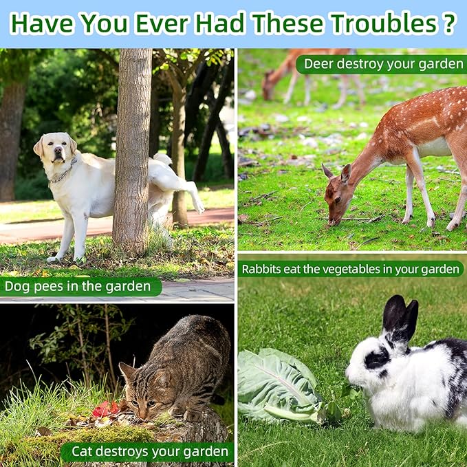 - Multi-Location Installation: Install easily on fences, walls, or the ground. The ultrasonic animal repeller outdoor is used for patios, gardens, farms, lawns and orchards, deterring a variety of animals including deer, rabbits, raccoons, and stray animals. Position it effectively by ensuring the unit is 9-10 inches above ground for optimal results
