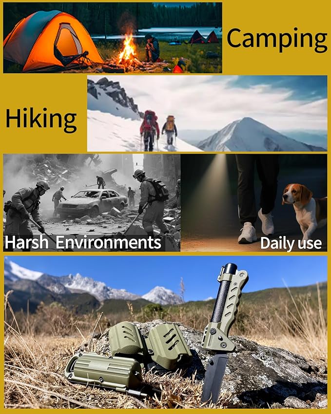 - Practical and Portable: This survival folding knife and flashlight set includes a high-strength rubber sheath with a back clip to protect the multi tool and securely attach to the belt for easy carrying and quick access; Ideal for outdoor adventures, camping, hiking, fishing and daily use